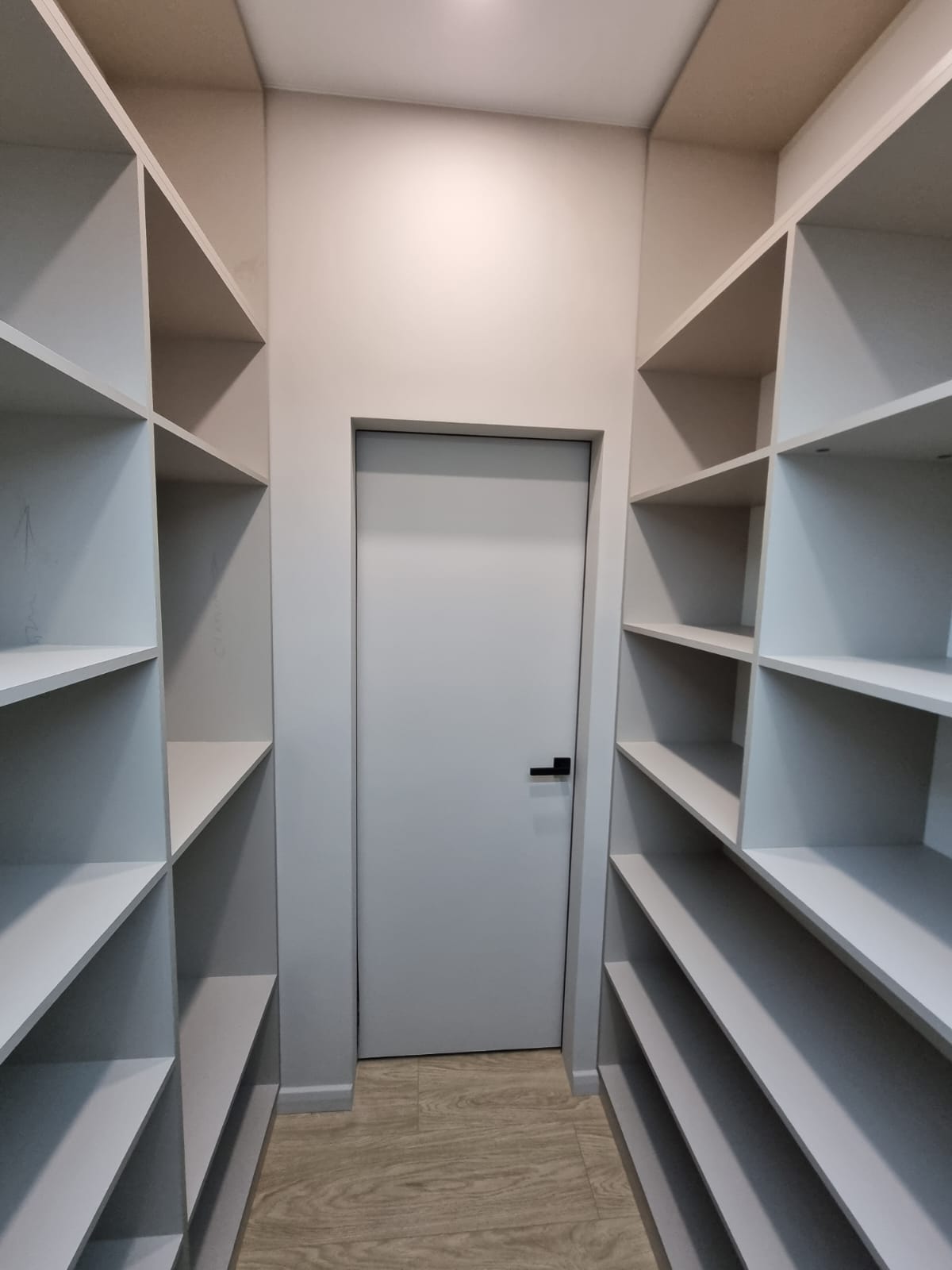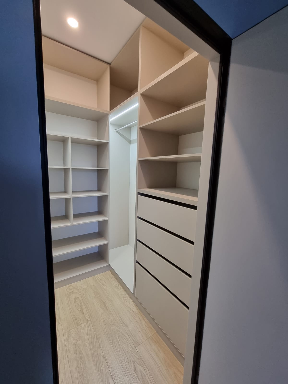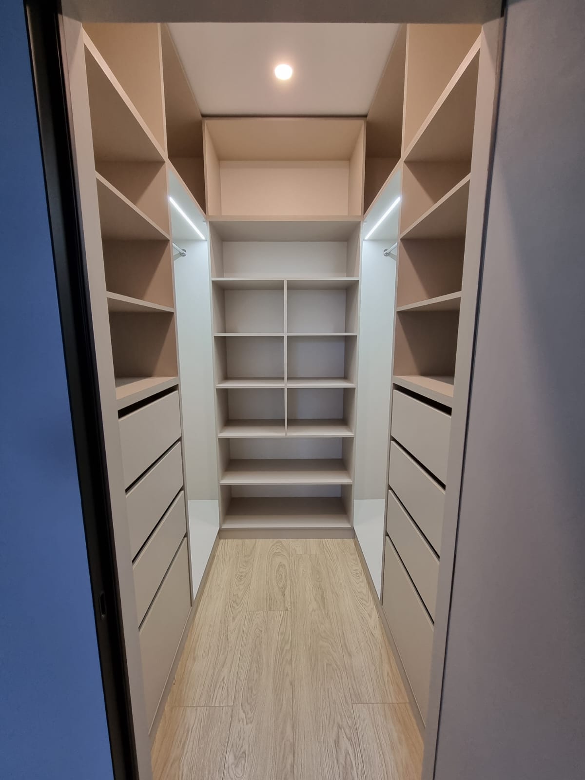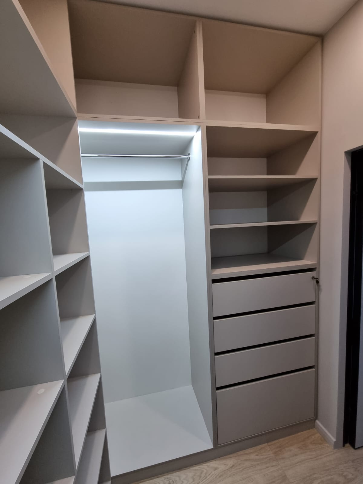 - Функциональность. Кроме одежды и белья можно определить место для бытовой техники, уборочного инвентаря, продумать экономичное освещение, например, с помощью светодиодных лент.