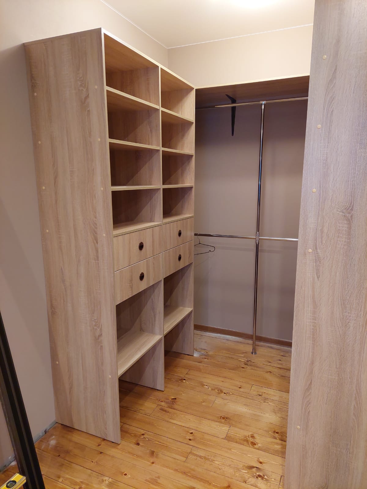 Гардеробная «Ясень» — вместительный набор корпусной мебели для хранения одежды, обуви, домашних вещей всех членов семьи. Комплект состоит из открытых стеллажей с полками, выдвижными ящиками, платяными отделами с двумя штангами.
