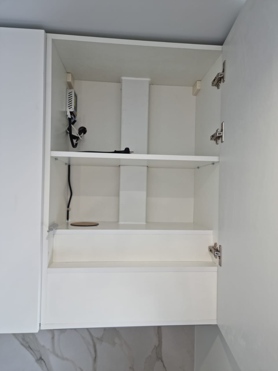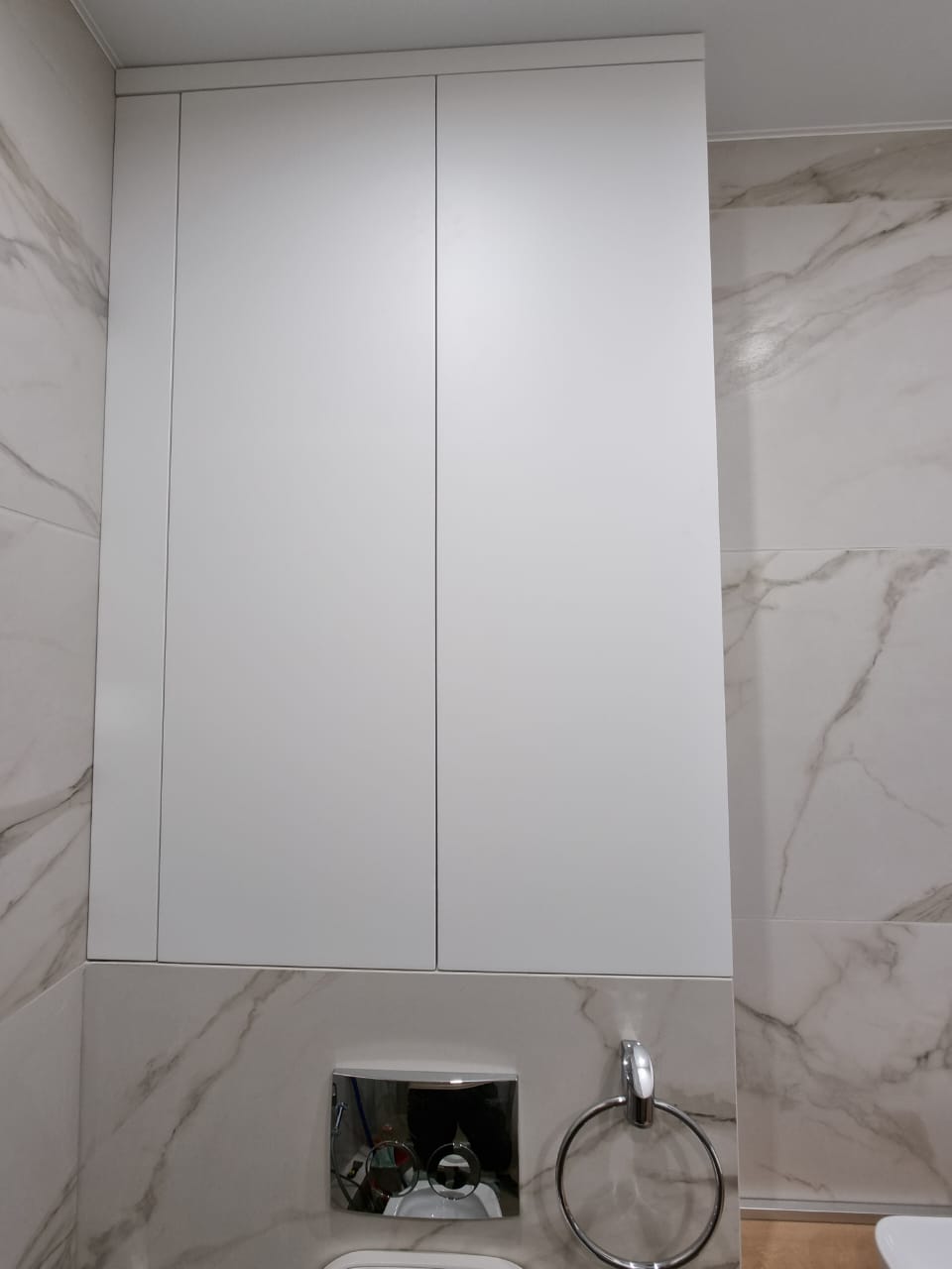 - Эргономика. Створки настенного шкафчика плотно закрывают внутренние секции с полочками, не допуская проникновение влаги, пара и грязи внутрь.
