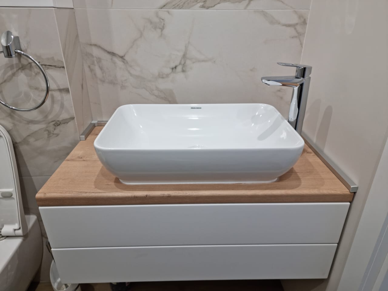 - Экономия пространства за счет компактности. Под навесной тумбой под раковину можно разместить стиральную машину горизонтальной загрузки.