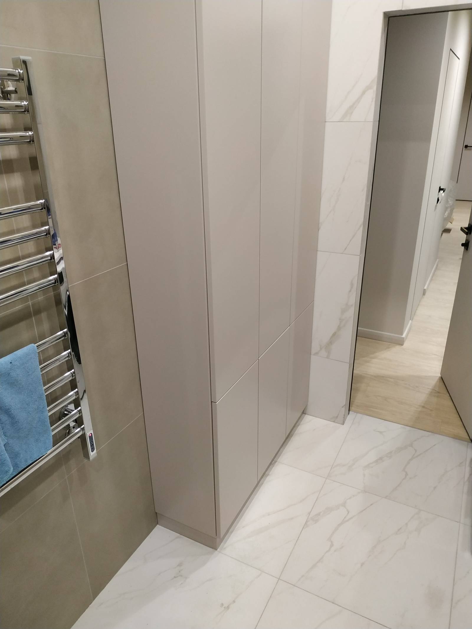 Компоновка модели продуманная. Наличие тумбы с раковиной позволяет разумно организовать хранение гигиенических принадлежностей, бытовой химии, а также аксессуаров. Стиральная машина встраиваемая. Это экономит пространство и создает аккуратный вид помещения. Шкаф-пенал достаточно вместительный. Подходит для хранения бытовых принадлежностей, хозяйственного инвентаря.