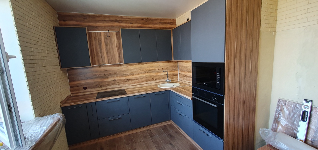 Кухонный гарнитур выполнен в универсальном лаконичном цвете, темно-синие фасады отлично сочетаются с фартуком, задекорированном «под дерево». Фурнитура выполнена в классическом дизайне, очень прочная, легко моется и чистится. Верхние подвесные ящики оснащены доводчиками, что делает кухонный гарнитур удобным в ежедневном пользовании. Дополнить мебель можно, установив современную встраиваемую бытовую технику.