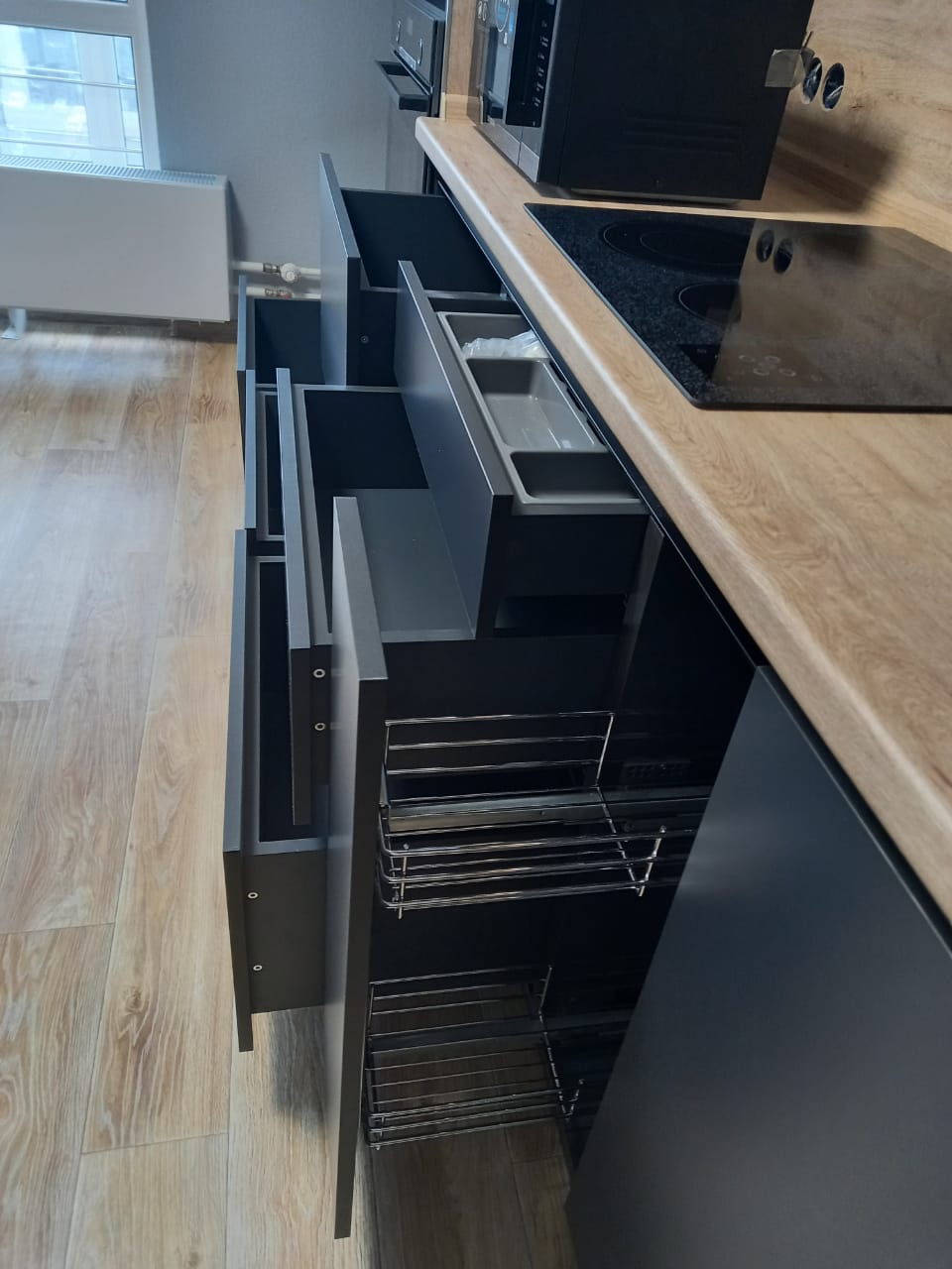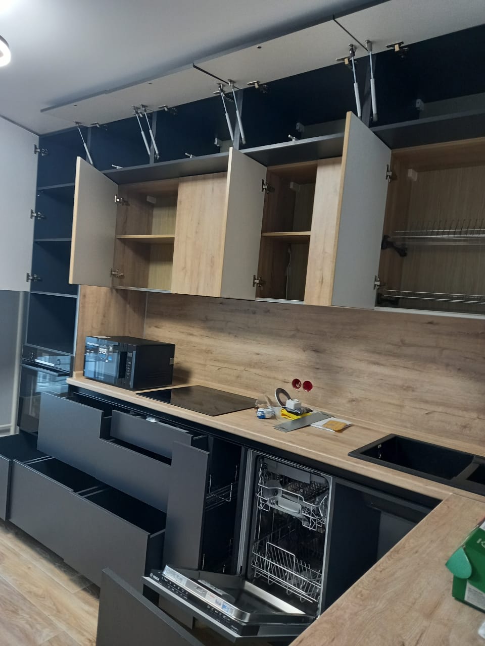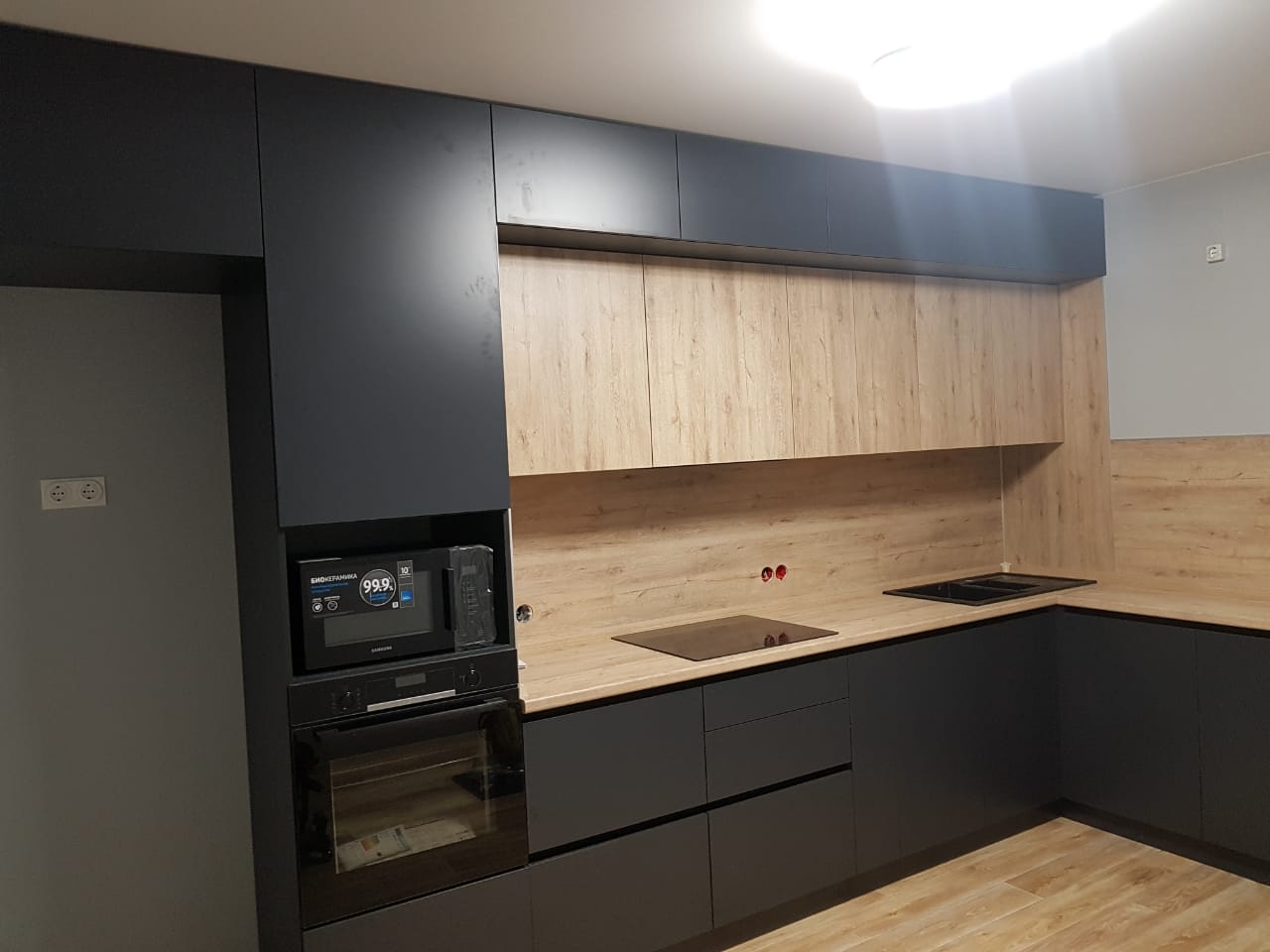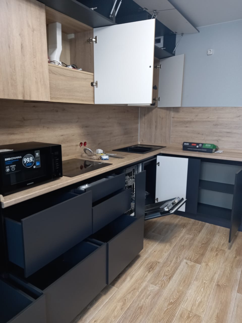- Без ручек, система открывания шкафов пуш-опен.