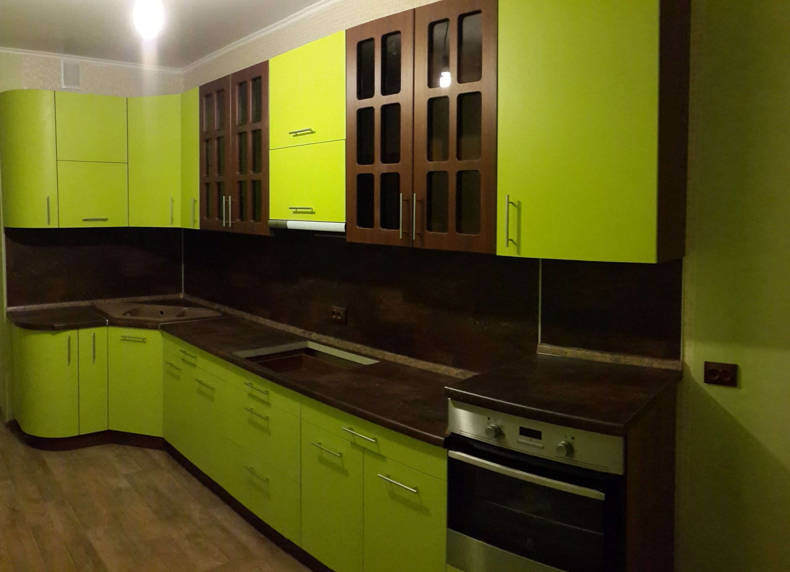 - Необычным обликом. Обеспечивается сочетанием яркой расцветки, фасадной части и коричневого оттенка, которым характеризуются столешницы, а также дверцы навесных шкафов, имеющих стеклянные вставки.