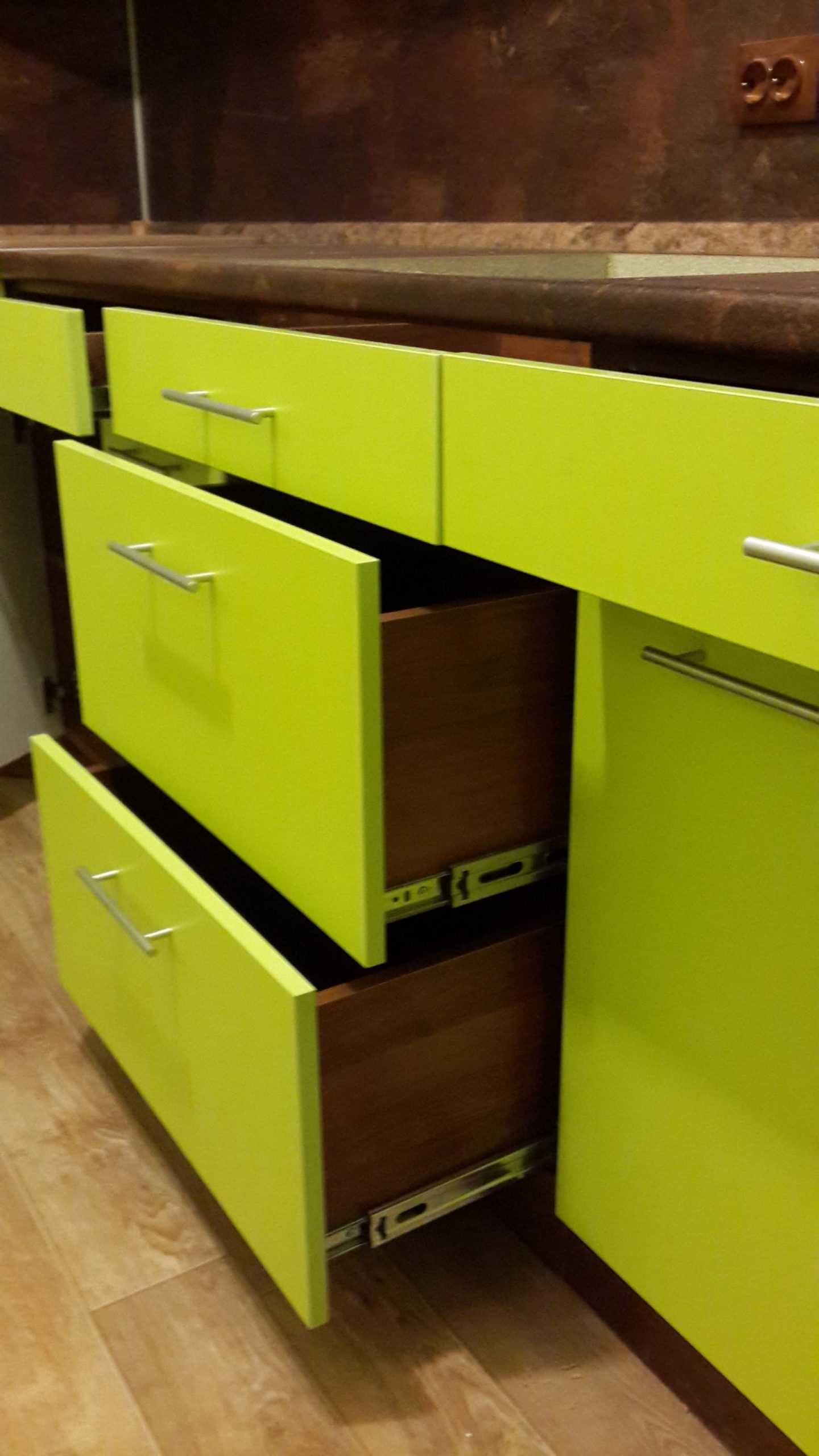 - Максимальной функциональностью. Гарнитур включает в себя огромное количество расположенных вверху и внизу шкафов, а также выдвижных ящиков разного объема.