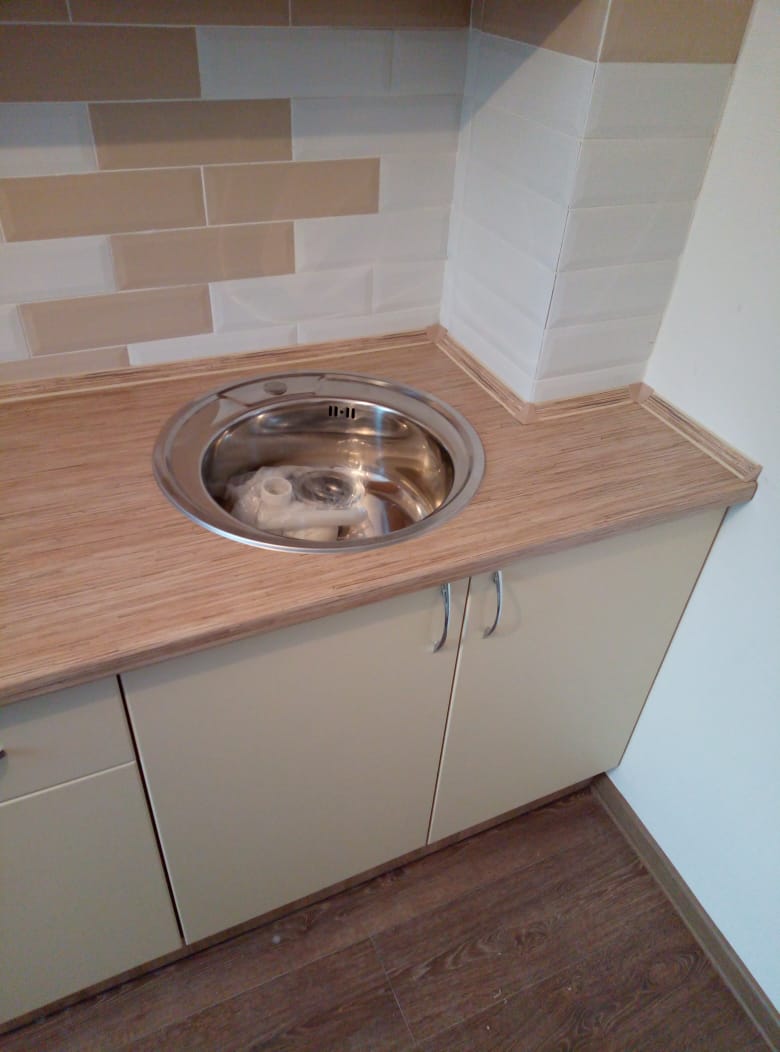Круглая глубокая раковина гармонично смотрится и хорошо выполняет свое предназначение. В ней удобно мыть посуду, овощи и фрукты. Дизайнеры предусмотрели минимальный набор шкафов: