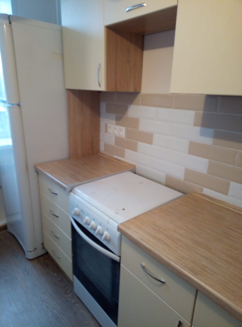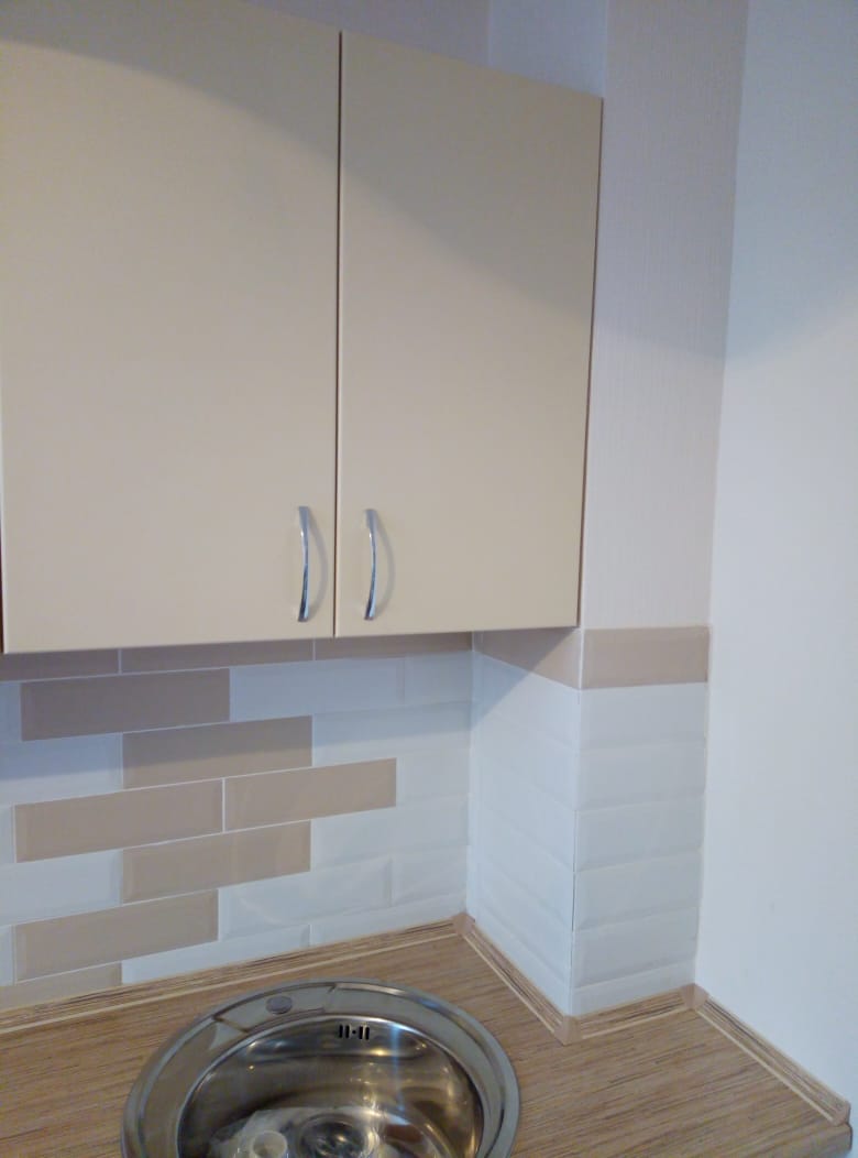 Прямая лаконичная кухня идеально подходит для небольшого пространства. Для изготовления используются ламинированные древесно-стружечные плиты.