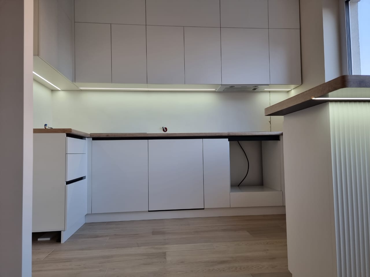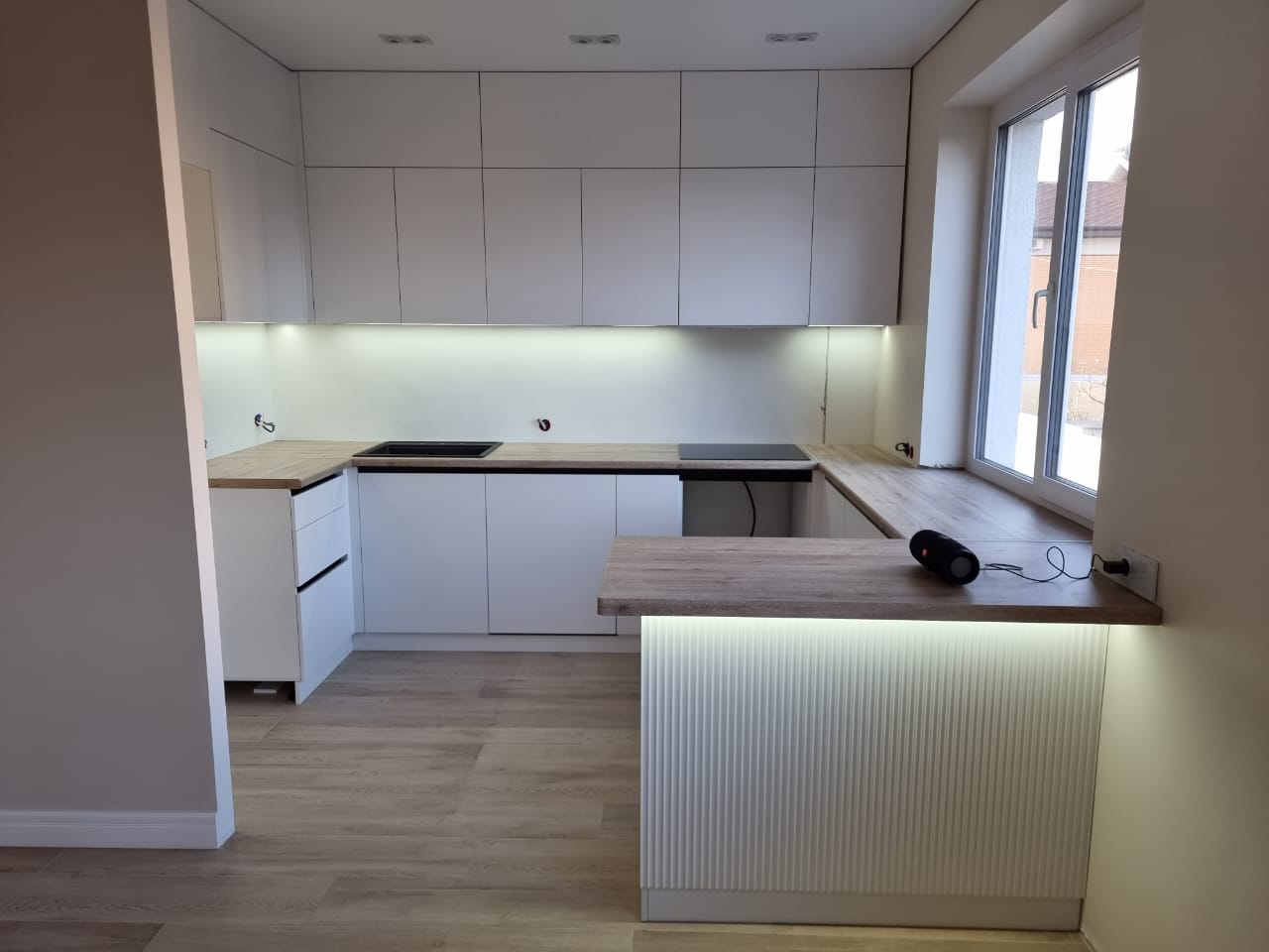 - отличается современным минималистичным дизайном, выглядит стильно и респектабельно — светлые фасады идеально сочетаются со столешницами под дерево. Отсутствие декора на кухне является плюсом — лаконичную гладкую поверхность без декоративных элементов значительно проще поддерживать в чистоте;