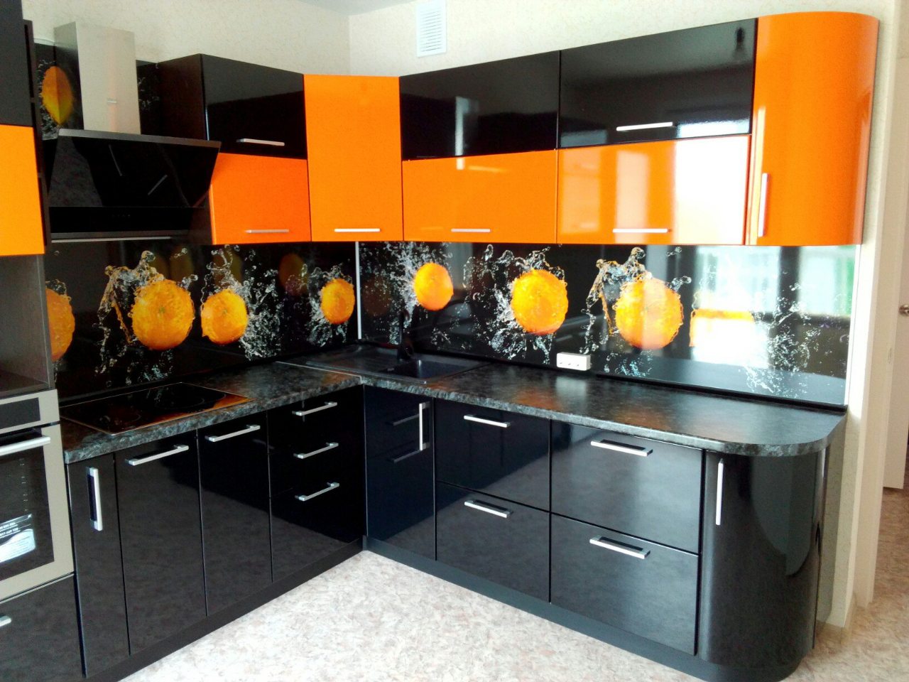 Кухня с глянцевыми фасадами «пленка черный/оранж»