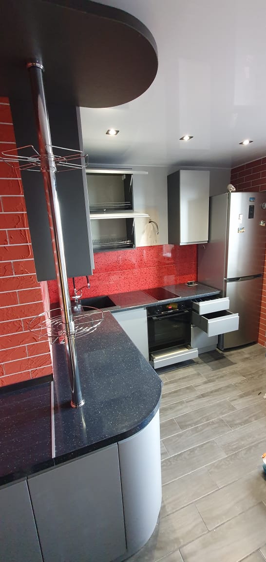 Угловой кухонный гарнитур с барной стойкой «Сити» эффектно дополнит интерьер кухни в самых популярных стилях: от классики до модерна. Изящный и лаконичный дизайн поможет практично зонировать пространство, сделав его удобным, как для приготовления пищи, так и для уютных завтраков, обедов и ужинов с семьей или друзьями. Комплект предусматривает установку всей необходимой, современной встраиваемой техники, вертикальные, объемные модули позволят компактно разместить в них посуду, продукты и другие предметы и принадлежности.