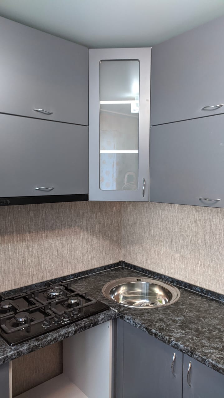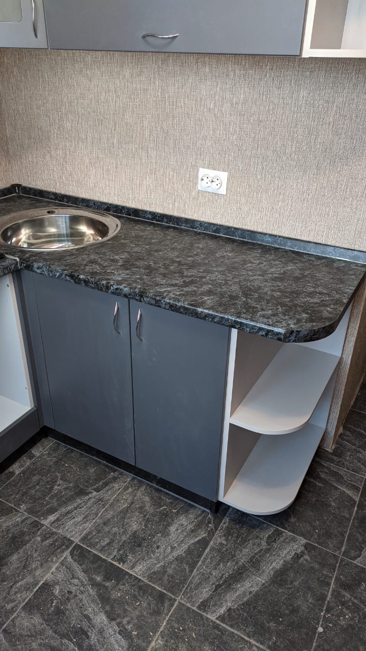 Эргономичный, комфортный гарнитур также отличается стильным нордическим дизайном. Спокойные серые оттенки фасада перекликаются со столешницей под мрамор, с природным рисунком. Такая красивая мебель подойдет для разных интерьеров: лофт, нордик, хай-тек, классика, модерн.