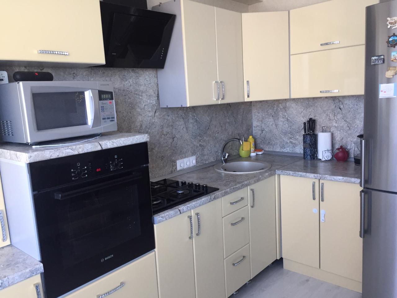 Кухонные шкафы выполнены в светло-бежевом цвете с глянцевыми фасадами. Верхние шкафы имеют лаконичный дизайн с серебристыми ручками, украшенными стразами. Они расположены вдоль двух стен, создавая удобное пространство для хранения.