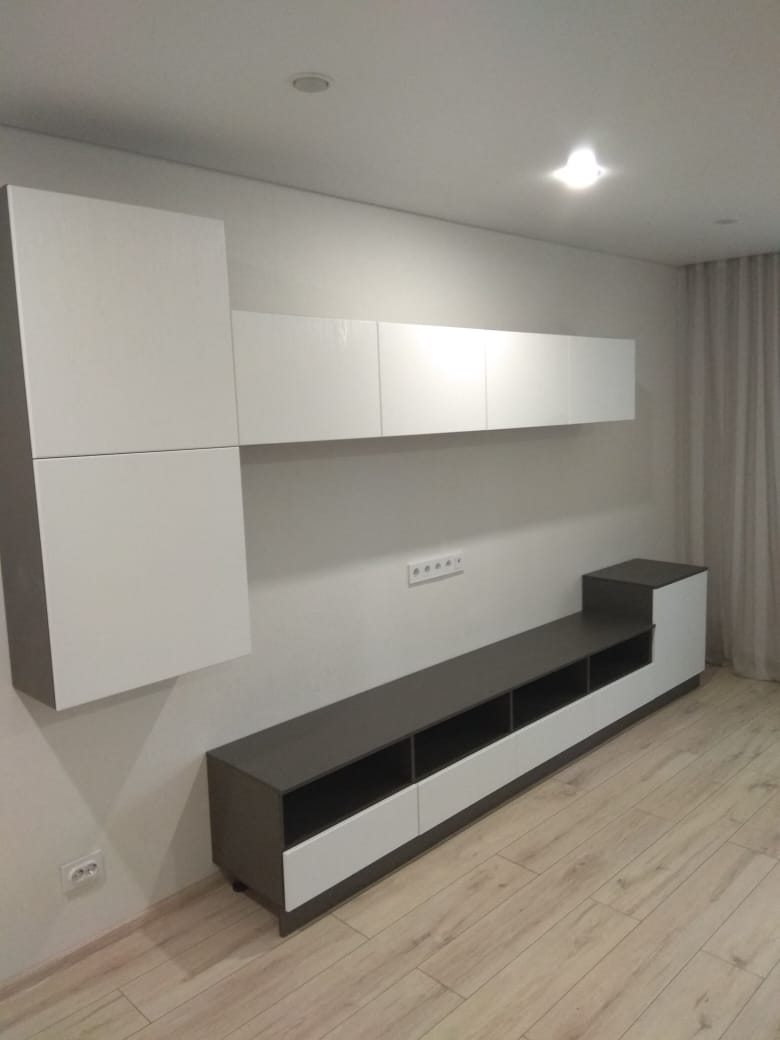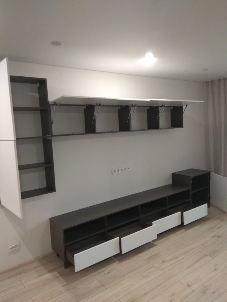 Стенка оснащена разнообразными элементами хранения, включая открытые полки и закрытые ящики. Это позволяет удобно организовать пространство: вы можете разместить на открытых полках книги, фотографии либо декоративные предметы. В закрытых ящиках можно хранить вещи, которые не должны быть на виду. Плавные механизмы открывания обеспечивают комфортное использование мебели.