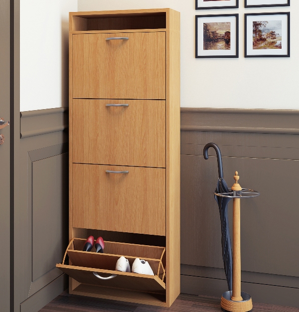 Шкаф для туфель и ботинок изготовлен из ламинированной древесно-стружечной плиты. Светлый древесный оттенок – это нескучная классика на все времена. Смотрится сдержанно и эстетично.