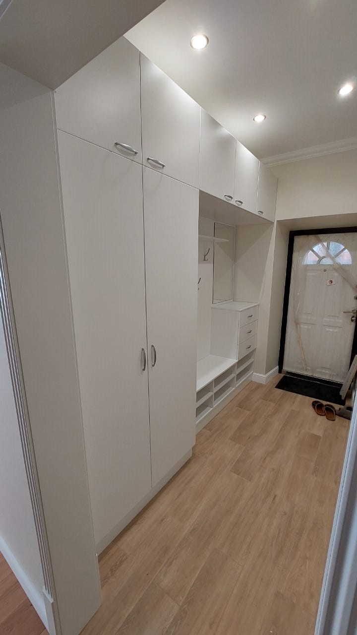 Комплект включает удобный и просторный шкаф для верхней одежды, тумбу с зеркалом, набор открытых полок. Распашная вешалка позволяет разместить любые предметы гардероба на плечиках в расправленном состоянии. Можно заказать оптимальные габариты мебельных элементов в соответствии с высотой потолка, организовать антресоли и дополнительные полочки и пр.