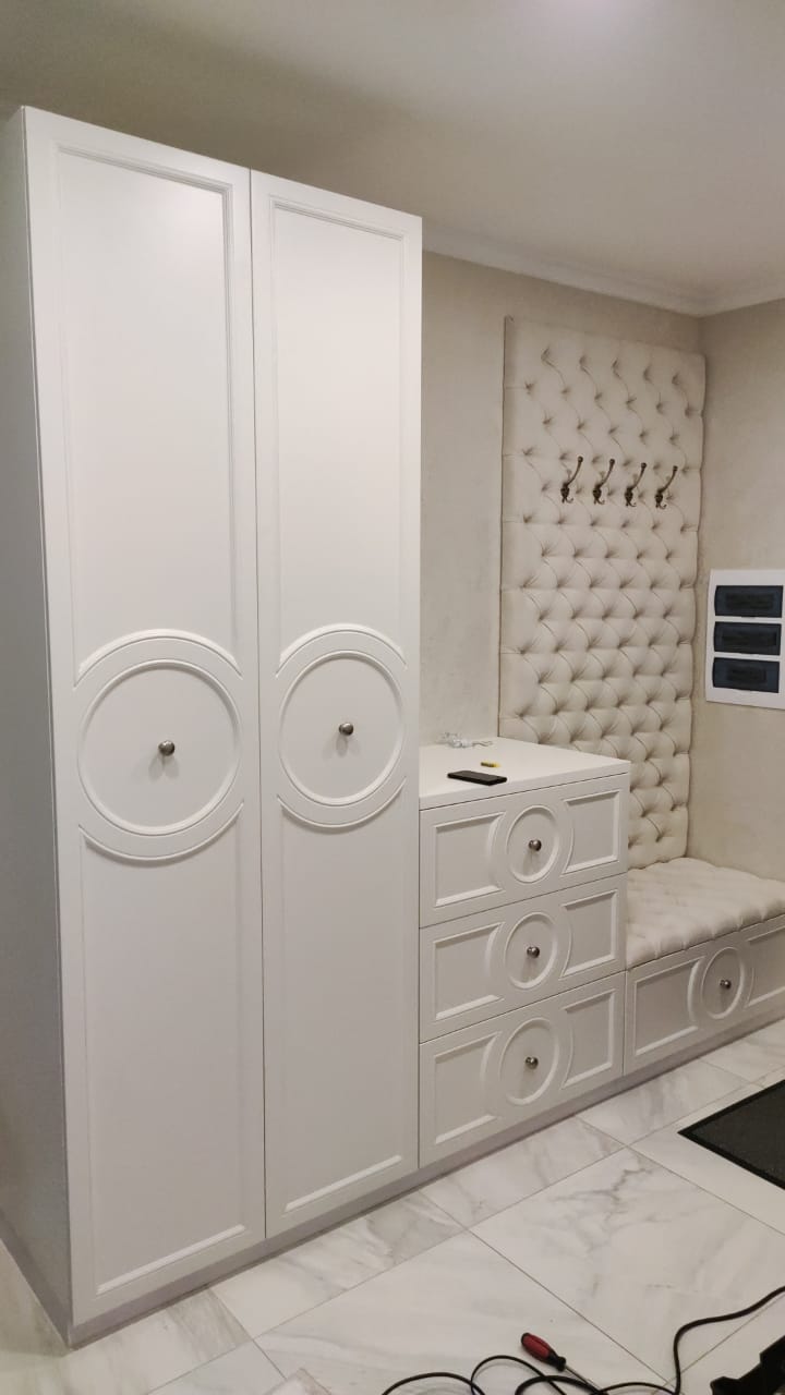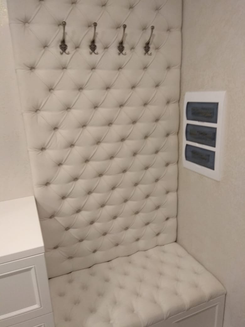 Белоснежная прихожая Шале создана для компактного обустройства малометражной входной зоны. Дизайн мебели подойдет для оформления интерьеров в стилях Классика, скандинавский, Прованс. Фасадная часть, выполненная из МДФ, изящно декорирована. «Каретная стяжка» на вешалке придает изделию элегантный внешний вид. Этот способ обивки гарнитура пользуется большой популярностью у ценителей красоты и комфорта.