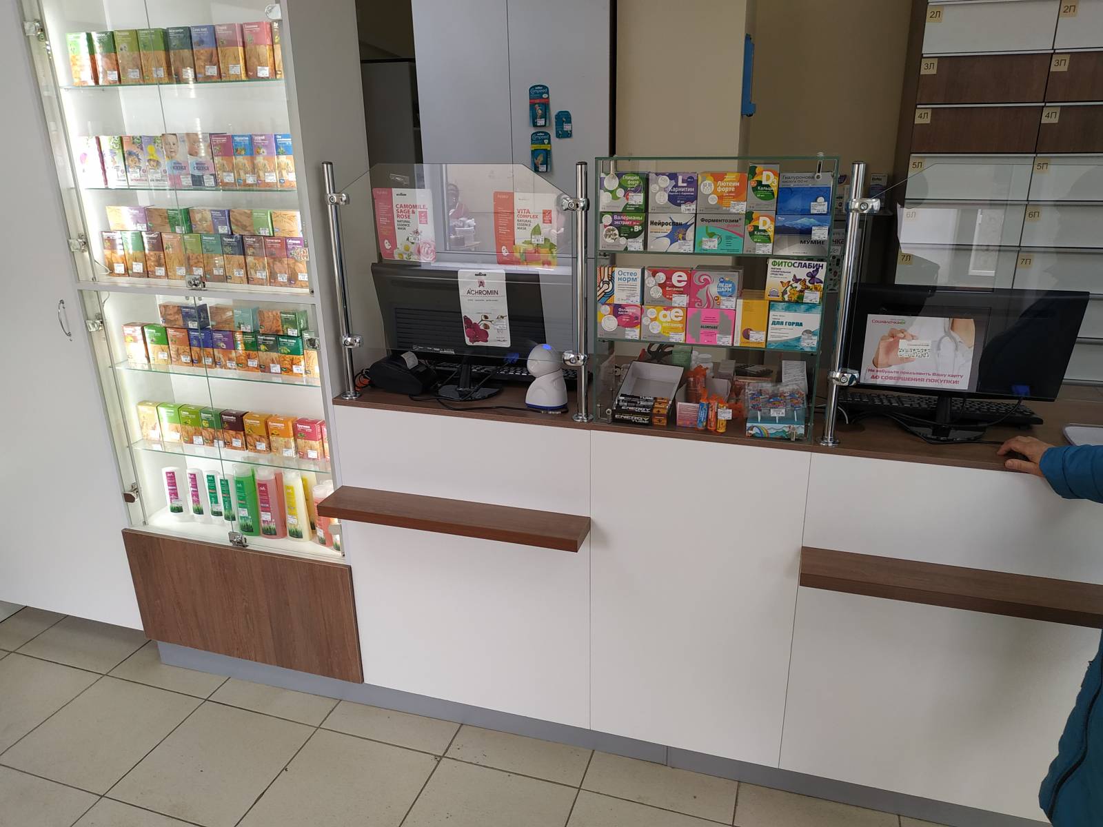 - удобство – оптимальная высота позволяет видеть покупателя и комфортно с ним общаться, одновременно отгораживая место аптекаря от клиентской зоны;