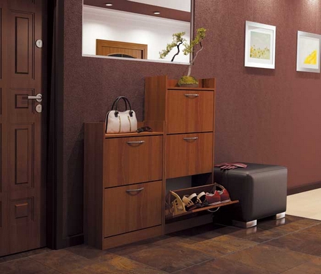 - Стеллаж имеет откидывающиеся дверки, упрощающие доступ к обуви;