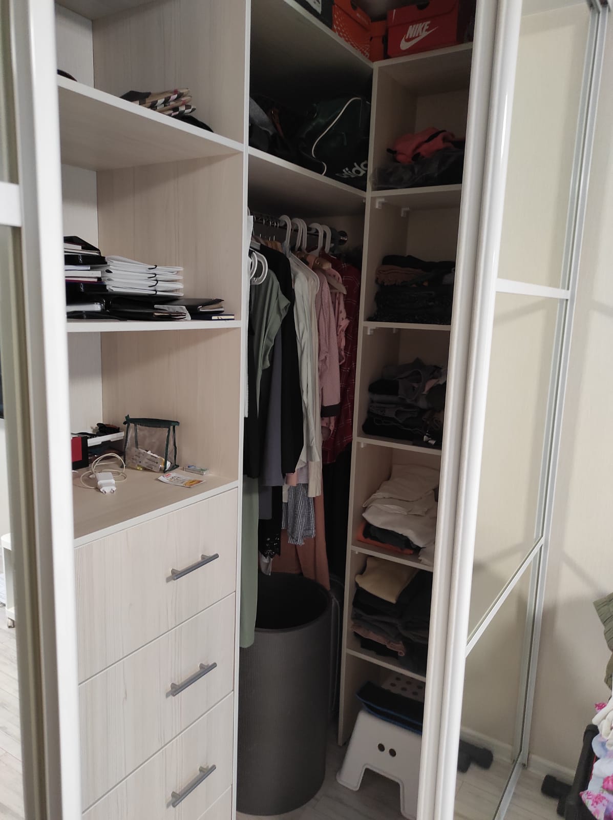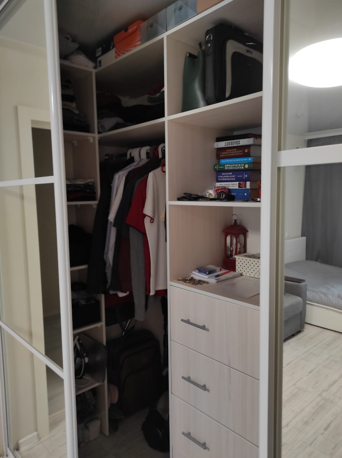 У модели раздвижные двери. Створки имеют зеркальную внешнюю сторону. Внутри шкафа есть следующие элементы: полки, выдвижные ящики, штанга для зимних курток или домашних вещей.
