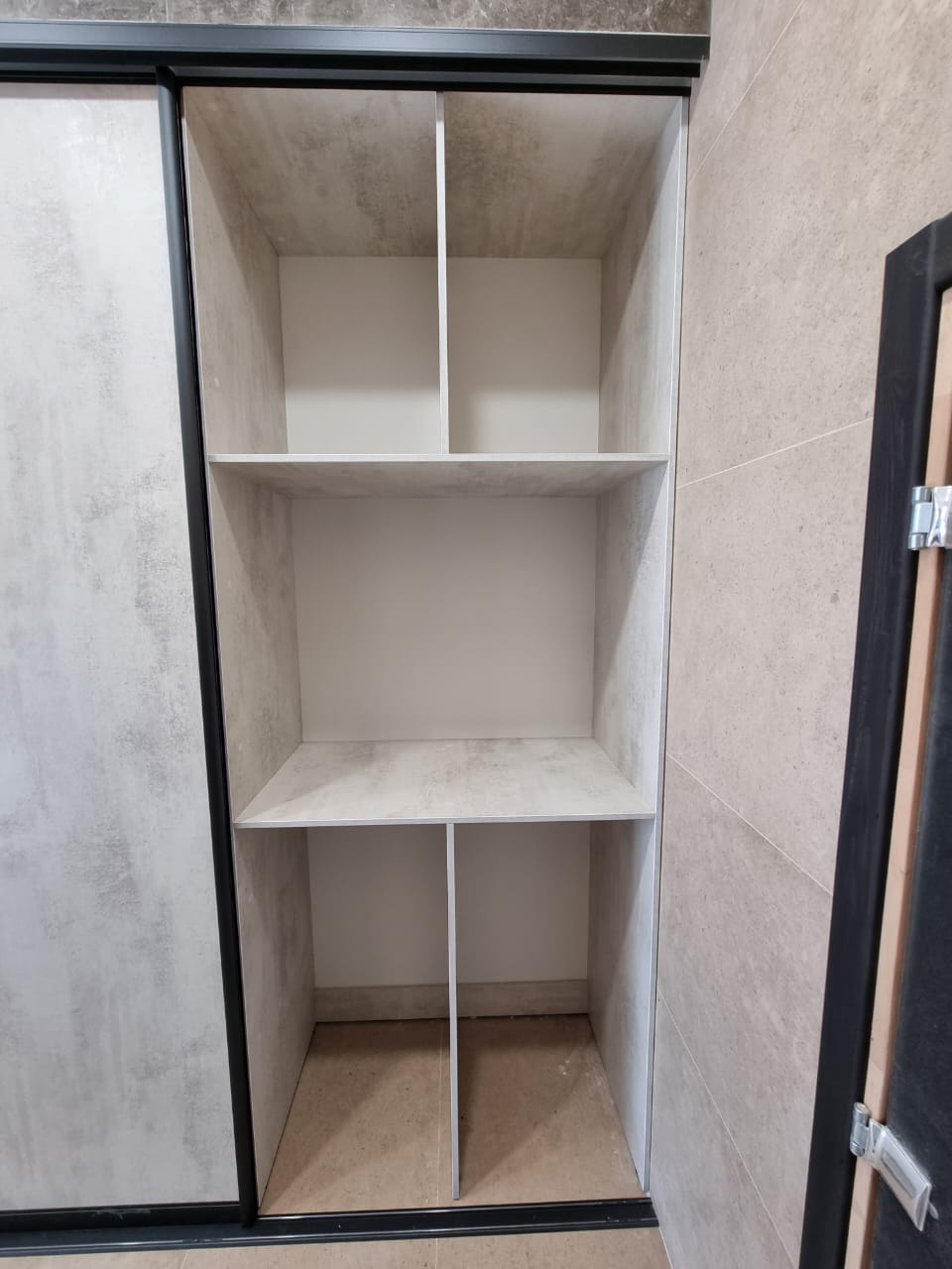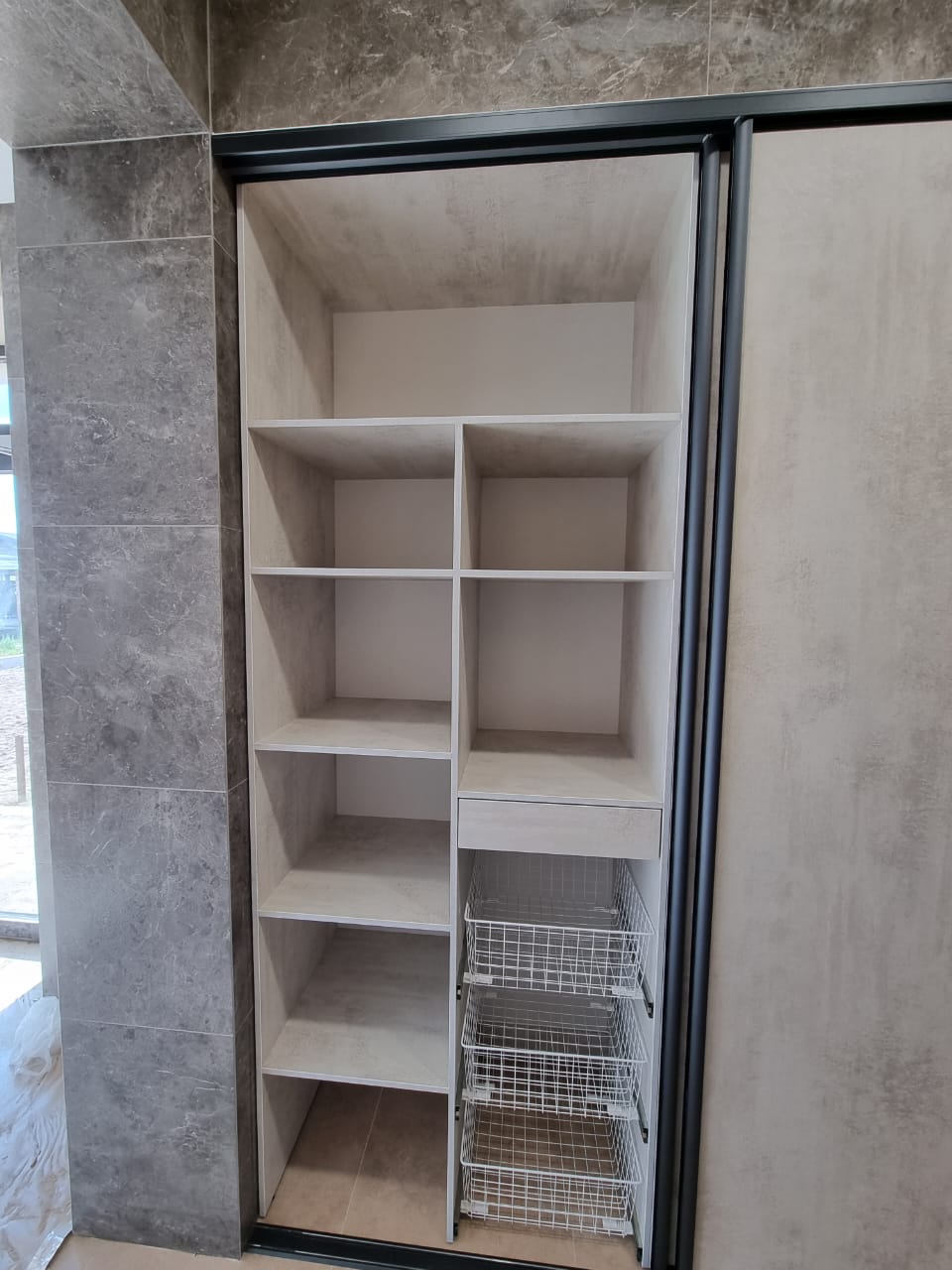 Основное отличие мебели состоит в просторных полках, на которых можно разместить крупные одеяла, подушки, покрывала, комплекты постельного белья. Они удобны для коробов с мелкими предметами нательной одежды. Внизу предусмотрены сетчатые выдвижные ящики для аксессуаров, домашней обуви, чистящих средств. Раздвижные створки надежно скрывают содержимое от посторонних глаз, а также экономят пространство. Цветовое решение идеально подходит для стильных современных интерьеров.