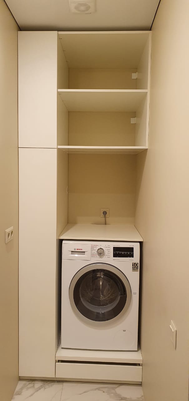 Наши мастера продумают установку вентиляции и дополнительных розеток. Все нюансы обговариваются заранее перед разработкой проекта. На дом к заказчику мы отправляем своего специалиста, чтобы сделать правильные замеры. На изготовление уйдет около двух недель. Зато потом владельцы жилья смогут грамотно организовать домашний постирочный уголок.