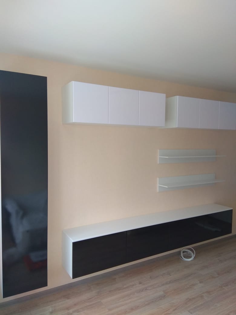 - Функциональное наполнение гарнитура, в состав которого входят узкий шкаф-пенал, длинная тумба, открытые и закрытые полки. Каждый модуль выполняет свою роль в системе размещения и хранения домашних вещей.